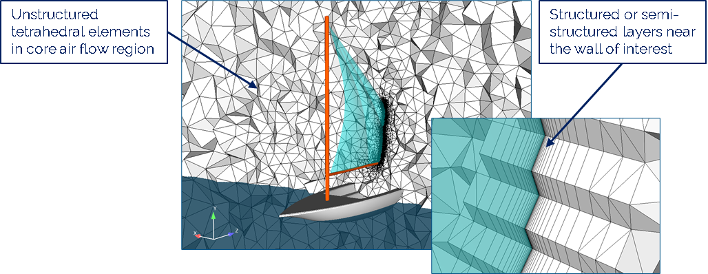 CFD Hybrid mesh strategy using CVM: Structured boundary-layer mesh is generated near the sail and wall surfaces to resolve near-wall flow, transitioning to unstructured tetrahedral elements in the core region for aerodynamic analysis.