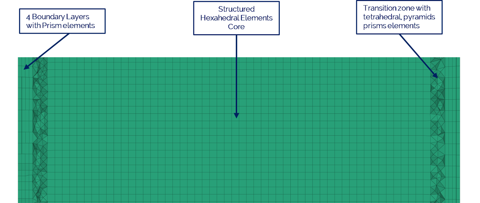 To balance performance and accuracy in CFD simulations, the hybrid meshing strategy discussed above can be further extended. To boost downstream performance while maintaining accurate boundary-layer resolution, the core volume is filled with less expensive hexahedral elements. Different element types are used to efficiently manage the transition zones between regions, as shown below. This approach significantly reduces the total number of generated elements, enabling faster simulation times and quicker design iterations.